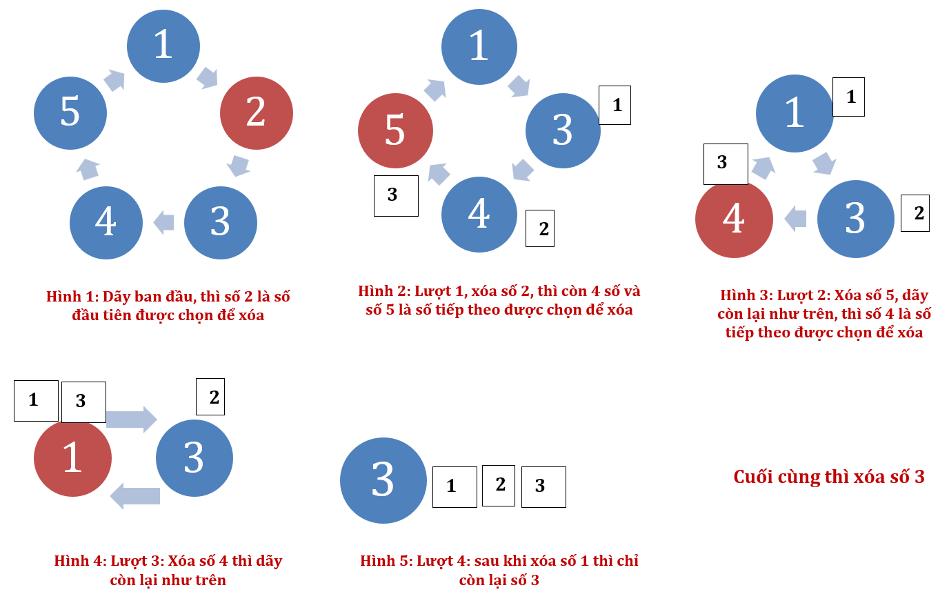 Giả sử với N = 5 bắt đầu xóa ở vị trí X = 2, chu kì K = 3 thì các bước xóa lần lượt như sau: