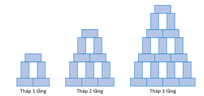 Trong chuyến du xuân tại Hồ Gươm, Lộc rất ấn tượng với vẻ đẹp cổ kính của Tháp Rùa. Khi trở về nhà, Lộc dùng các khối đồ chơi hình chữ nhật giống hệt nhau để xếp thành một mô hình tháp nhiều tầng theo quy luật như hình minh họa dưới đây.